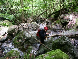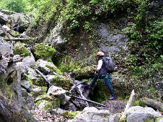 渓は細いが、途中、快適な滝が続く。中盤になって、大きい滝が現れ、右岸を巻くことになる。勾配の強い斜面をかなり上まで追い上げられるが、沢への戻りは容易。