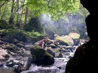 ゴルジュ帯をそろそろ抜ける頃、上流からの風に焚き火の匂いが混ざるようになる。