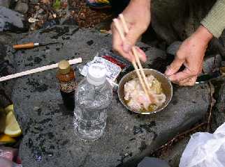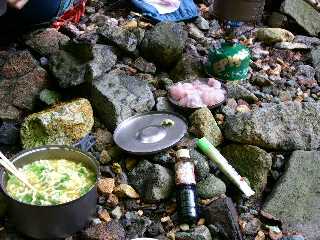焚き火の主は3人の釣師で、宴会の準備中。彼等は、ここから上流に釣り上がり、戻ってきたところとのこと。釣果を問うと、小さいサイズばかりで、大物は姿すら見えなかったと言う。