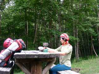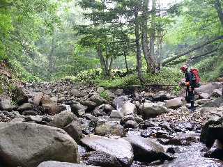 程なく一の鳥居着。実は、僕と山女は99年の10月中旬に、銀山平からここ一の鳥居、そして庚申山、皇海山、六林班峠、庚申山荘、銀山平というワンデイハイクをエンジョイしている。だけど、今の二人はすっかり記憶が途切れ、というよりぶっ飛んでしまっているものだから、一の鳥居を見ても、そうそう、こんな感じだったわね・・って感じだ。