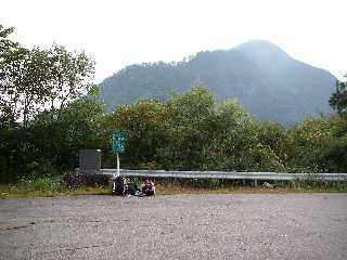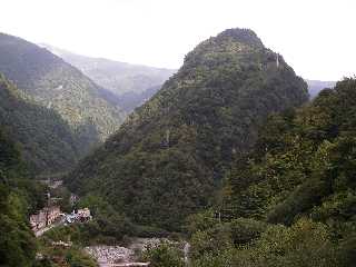 "またこの吊橋を渡る・・ 帰りは、ここからが核心なんだ 荒川右岸に付けられた林道から鷲ノ住山を振り返る。2本の鉄塔が目印・・"