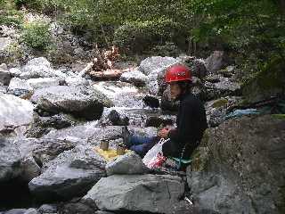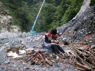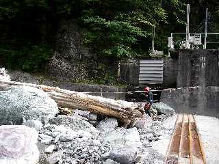 "一旦、覆水した北沢に流れが復活する頃、取水施設が忽然と現われる ひとまずお茶にしましょう。天気も峪も、最高ですね!!"
