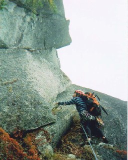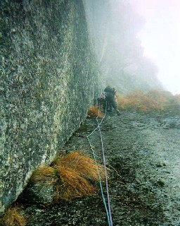 しっ、しかたがない、行くか、と身繕いの後、消極的な作戦に出る。1ピッチ目、目の前のランナウトするスラブは避けて右のブッシュ沿いのラインをてくてく上がって行き、その後、松の木テラスまで左トラバース。まずまずのスタート。サイは投げられた。行くしかないか・・と言いながらも、依然、何か何処かに帰る理由は・・、と言い訳ファインディングばかりしているものだから、肝心なルートファインディングが疎かになり、2ピッチ目の始まりのやけに力のいる小ハングを越えて上のフェースに上がり込んだところから誤る。自然に左上するちっこいバンドにばかり目がいってしまい、本当は右寄りに上がり込むところを見落とし、この左上小バンドへのとっかかりに行きつ戻りつする始末。「右上じゃないの!」と下からの親切な声に我に帰り「そっかー」と返したときに見た彼女の目は「まったくもう・・」と言っていた。確かに、人の手垢の形跡などなく、綺麗に生えそろった元気のいい草付だから、ここでないことは見りゃ分かりそうなものだった。かなり辛目のグレードを感じながら、なんとか2ピッチ目を終了。