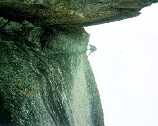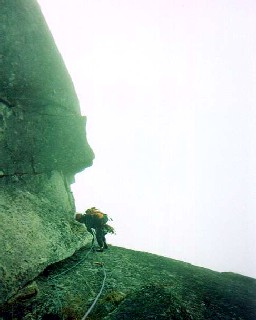 3ピッチ目はフリーとはいかず、ここも辛いグレードに悪態をつきながらのA1混じりのクライミング。ピナクルテラス直前のかなり悪い電光型ランナウトをなんとか無事切り抜けた頃、羽矢の病は陰から陽に切り替わった。ここからラッペルし、取付きに戻った場合の八丈までのしんどい登り返しを選ぶより、見事完登した方が男ぞ!という逆転の発想に因るもの。突然、やる気モードになった羽矢は、「天気いいから、人工登攀もやりがいがありますね」と訳の分からないワンフレーズを残し、颯爽と4ピッチ目の人工登攀に取りかかっていく。被り気味の壁をA1で直上する頃、高度感を体で感じるようになり、ますますヤル気モード。「やっぱり、本ちゃんはいいですねー」と、かましはじめるまでにハイモード。