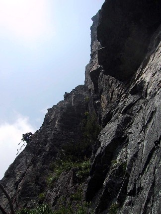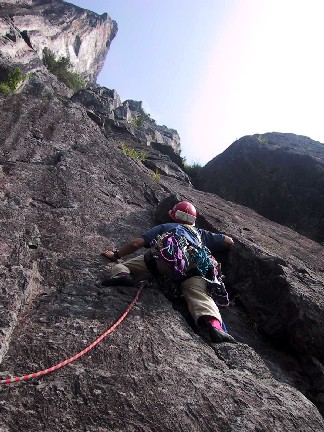 続く5ピッチ目は5.8のフリー。右上方のカンテラインに向かって一旦上がり込みカンテを攀ろうとするが難しい。いったん2歩戻ってナイフを打ち込んでバックアップとし、再度チャレンジ。ホールド遠く結構マジなボルダームーブ。その上は快適で高度を稼ぐ。終了点の立ち木のテラスに入るスラブの右トラバースが悪く、足のクロスムーブが入った。このピッチ、最初とこの部分が難しく、5.8なんかじゃなーい、と叫びたくなる。
