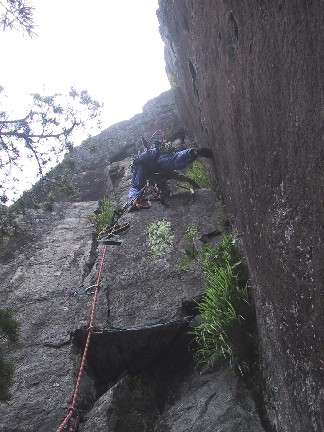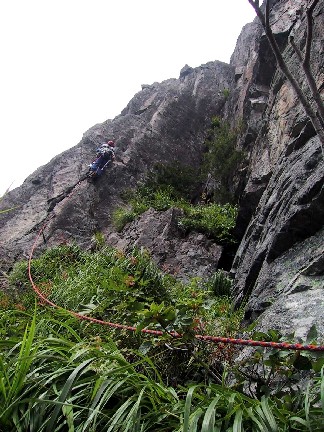 続く7ピッチは凹角通しに攀っていく。上部で凹角が草付に変わる部分は被っているため、凹角左へ逸れるように上がっていく。実はここからの草つきが結構悪い。途中、ハングしてきて、力のいるクライミングとなる。まめにブッシュ、カムでランニングを取っていく。傾斜が緩み大きな木に到着するころ、声の通りも悪くなるためピッチを切る。