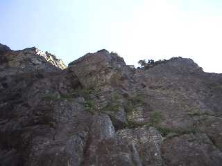 "取付きよりルートを見上げる(3ピッチ目のハングはすぐそこに)"