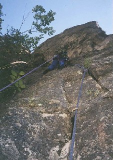 「日本の岩場」によると、1ピッチ目はグレードVで小さな三角ハング下でピッチを切るようになっている。なるほど、Vのグレードで上がっていくと、この三角ハング下は立派なテラスで、ビレーするにはもってこいなのだが、ビレーアンカーが見あたらない。目を凝らしてもない。しかし、この先ハングを左にかわすように延ばすとすると明らかにVではなく自分ではA0になりそう。2ピッチ目だとフリーなら10cだからと、右方向を探ると、右方2m、テラスが狭くなった所へリングボルトが一本とハーケンがある。そこで、とりあえずここで切ることにする。