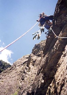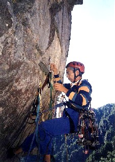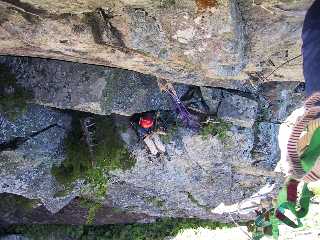 左の直上クラックはカミングの状態も良好となり、ハングを越える。得ていた情報通りリングボルト一本のビレーポイントでピッチを切る。カムで補強するらしいが、浅くしかも若干フレアー気味のクラックと上の方に脆そうなクラックがあるだけ。リングボルトも結構浅打ちでしびれる。上にはHBのブラス5番を決め、左下には赤エイリアン、赤キャメ、黄キャメで(いずれもボンバーとは言い難い)で固め取りをし、ロープをフィックスする。クリーニングの碓井は直上から左へ変わるところで大きく降られ奇声をあげていた。いつも、この人は振られるときには奇声をあげなくてはいられない性分らしい。顔はと見ればいつだって嬉しそうな顔をしているのに。