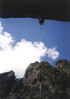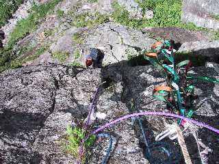 続く2ピッチ目も華麗なA0テクニックを駆使し、颯爽と高度を稼ぐ。決してクラックが濡れているからとか、泥が詰まっているからとかではない。岩のコンディションはからからの最高コンディションなのだが、フリーの実力をわきまえている羽矢は端から努力することは放棄し、A0ビシバシ君で行くことで、この後に続く3ピッチに向けて体力温存を図る。大テラスへの上がり込みはちょっと立ち木の枝がうるさいけど、これも、いいホールドとなっている。ペツル2本の立派なビレーアンカーに次の奮闘を考え、慎重に万全にビレー工作(初登者の山岡氏らに感謝いたします)。