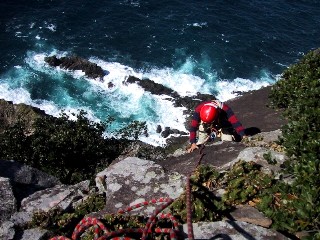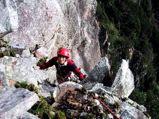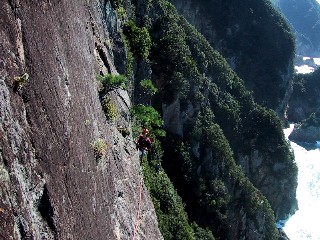 続く6ピッチ目のスタートは、スーパーレインと共通のテラス右寄りの突っ立ったクラックから(ギアが重かったからA0になりました)、直ぐに分かれて右向こうのすべり台状のスラブへ入っていく。入るときの2歩が、結構怖かった。また、滑り台に入っても錆びたRCCボルト1本で結構ランナウトし(ちょっと真剣)、上部では左へ少しトラバースするようにブッシュ帯へ上がりこむ。