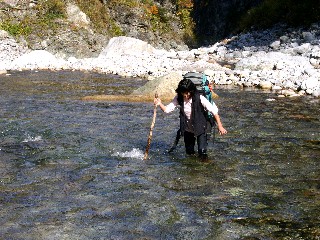 直ぐに着替えとパッキングとを済ませ、歩きのモードに切り替え、まずは左岸への渡渉にかかる。しかし、昨日と比べ確実に水量が多く流速も速い。碓井さんを下流側からからサポートしながらの渡渉は超マジ。それでもなんとか無事最後の核心を終える事が出来た。固い握手。さて、富山に行って美味い魚を食べましょう。