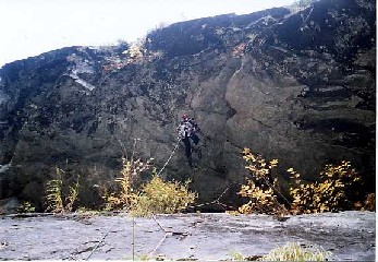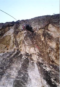 終了後、お互い気をつけましょうと褌の紐を、いや、ゼルバンを、いやハーネスを締め直し、直ぐに下降に移る。後続の混成パーティとは、彼らがラスト4ピッチ目をスタートしたところですれ違う。このとき上から見て左側に寄り過ぎていて近藤・高見のラインでピッチを切ることになったが、ハーケン2本とボルト一本のビレーポイントだったことから難儀することなく次の京都の下降ポイントへ辿り付き、さらに順調に下降を続けた。