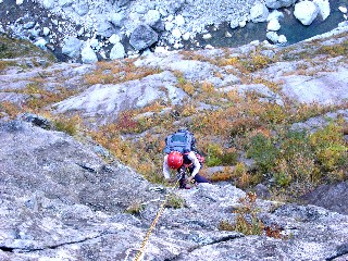 傾斜が強く広いフェースを行く。フリーではランナウトする。ところどころで人工が入る。どのピッチもそうだったがリングボルトは浅打ちで、しかも雪崩れに舐められ、お辞儀をしているものがやたら多く、プロテクションがプアなフリーからエイドに入るときには非常に気を使わせられる。