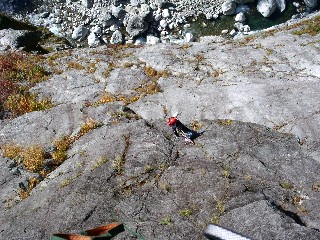 トポでは4級マイナスのピッチだけど相変わらずフリーは緊張させられる。直上の後、左上方へ気持ち上がっていく。結構すごい草つきの中のスラブと浅い岩溝という印象が残っている。ここまでに、リングのないボルトも散見されたが、我々は太めのリベットハンガーを持参していたことから、それなりにランニングとして使えたと思う。