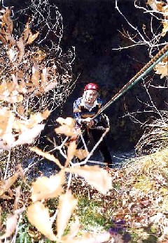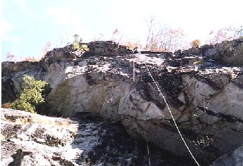 最終ピッチだ。A2のハングは心なしかピンが近く感じられる。上のフェースに出ると終了点のブッシュ帯は直ぐそこだが、もう一つ小さいハングを超えることになる。実は、この最後の濡れたハングが結構厄介だった。また抜けても苔が全面に生え、水を滴らす状態の傾斜面にずりずりしながら左側の細い木の枝を引き寄せなんとかずり上がる。数m登り、太い木の枝に巻きつけられたシュリンゲの束を掴んで終了。碓井さんも快調にフォローし、12時過ぎに二人揃う。やったー!!