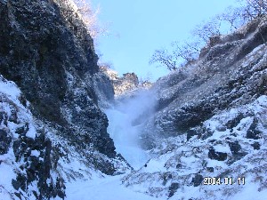"雪煙を上げる大滝遠望"