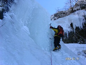 門のようなゴルジュ入り口は、短いながら立った氷瀑。ここは各自フリーソロで抜けていく。