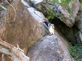 "適当に登って、ロープの流れが悪くなったところで、ピッチを切る。 びしびしロープを延ばす碓井さん"