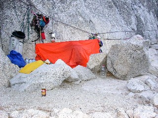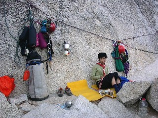下部3ピッチは、クライミングは易しいけれど傾斜がないためホールバッグは引っ掛かりまくり、面倒な荷揚げ。ディナーレッジへは、まだ早い時間に上がり込む。今日は貸切。こんな暑い日だし、貸切は当然かな。