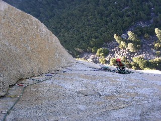 今日は、ガイドブックの指示するとおり5ピッチの中間部まで攀って、その日のクライミングは終了。ディナーレッジの西側端にある一本の木立が日陰を作ってくれるから助かるけれど、日照は強烈だ。