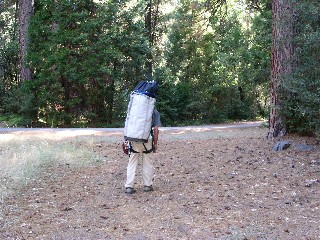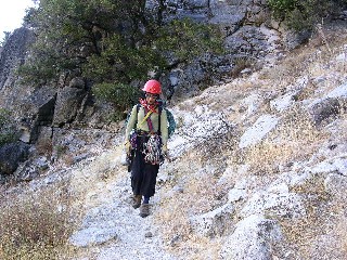 アワニーホテルからゆっくり歩いて15分少しで、このサイクリングロードを離れ、クライマー道へ入っていく。クライマーへの警告板(持ち上げたものすべて持ち帰らなければならないと書かれた掲示板が、ホーストレイルを横切って直ぐ奥に見つかると正しい。)の傍らを通り大岩が累々と山積みになったガレをケルンに助けられながら上がって行く。アプローチは近いはずだが、重いホールバッグに汗が噴出す。