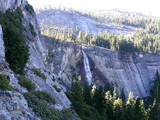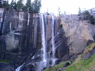 程なく、第1ポイントに到着。マウンテンショップの定員が言うように、ミストトレイルを進むとネバダフォールに向かって道が九十九折れに変わる直前にリバティーキャップの壁にタッチする形になる。右はネバダフォールへ向かう一般道。スネークダイクはここで左にとって、リバティーキャップの壁に沿って上がって行くというもの。情報どおり壁に沿って行く。程なくネバダフォールの全容が見えてくる。この滝も立派だ。この時期、すっかり水を枯らし、有名無実となってしまっているヨセミテフォールは是非とも見習ってほしいものだ。