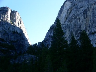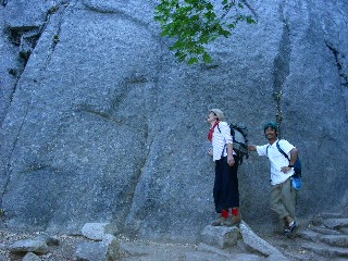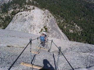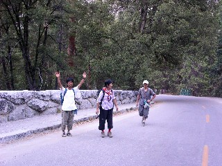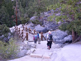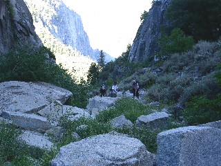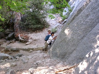 ワイヤー"梯子を下りてしまえば、あとは埃っぽい道が延々と続く。途中、ハーフドームトレイルからジョウンミュアートレイルに入り、リトルヨセミテキャンプ場を突っ切り、ミストトレイルに入っていく。酷暑のこの時期にもかかわらずハイカーの装備は軽装で、と言うよりペットボトル1本を手にしただけの輩も多く、そんな連中は、一様にばてている。下山が核心だ。ネバダフォールの音を左に聞きながらジグザグに下りていくと見覚えのある場所、そう、壁タッチのポイントに出た。もう、気を緩めてもよさそうですね。ぽちぽち下っていきましょう。