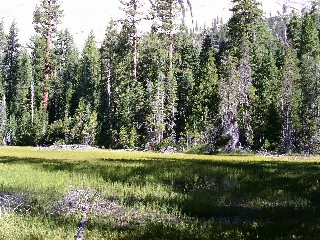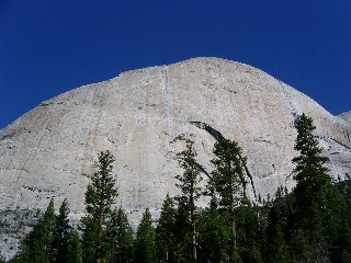途中、大きい岩塊が積み重なるようになるが、それなりに歩きやすいラインをとっていくと左側にハーフドームの頭らしいものが見えてくる。ハーフドームを左手にしたまま暫く進むと、踏み跡は次第にハーフドームに向かうようになり、平坦な広い場所へ出る。目の前には、普段、雑誌の上でも目にする事のないハーフドームの裏側、南東壁がそびえている。でかい。また、目の前にはロストレイクの湿原が広がり、乾燥しきったヨセミテにもこんな桃源郷があったのかと、少しびっくり・・