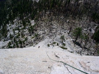 なんとか焼け残った立ち木の日陰で登攀準備。「FALCON GUIDE のRock Climbing Yosemite's Select」の92,93頁にスネークダイクのトポとルート写真が紹介されているが、はっきり言って写真は微妙に誤っている。また、今年、FALCON GUIDE からSUPER TOPO フリールート集が発刊されたが、こちらも旧版のパクリで、同様。
