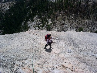 "6ピッチ目。おいおい、クライミングだから3点支持が原則ですぞ トポでは8ピッチ。だけど、もう一ピッチ延ばしてロープを解く"