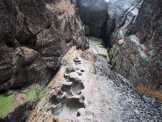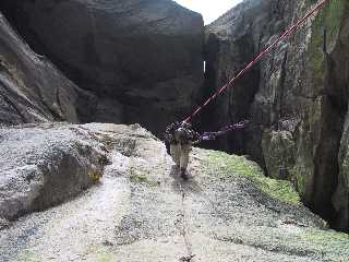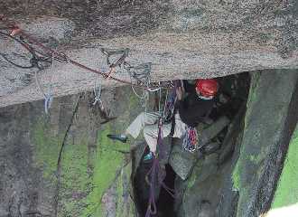 右向こうには中央洞穴を攀った時の最終ピッチが見えるが、目の前の傾斜の強い泥のガリーを行く。見た目以上に傾斜が強く、乾いた花崗岩の風化土はずりずりとして登り辛い。途中バックアンドフットなども入り、結構、ストレニュアス。なんとか抜けきり、オフビレー。