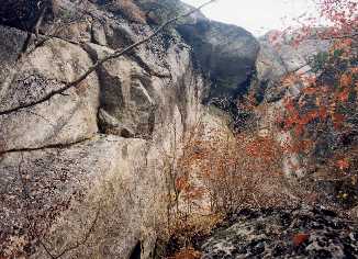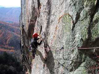 本日のメインディシュ。初めはきっちり打たれたボルトに沿って直上し、次にボロボロの、本当にボロボロのハング付け根の下向きクラックへキャメロットの赤を決める。一度強く引いてテストした時点で、まず、浮いていた部分がぼろぼろと剥げ落ち、二度目、三度目のテストで周りの風化花崗岩は崩れ落ち、さらに、そのカムに乗った時点でカムが押し潰した部分のみ孤立した状態にまで周囲は落ちきった。この時点で、僕は、この春、けなげに花を咲かせていた老木「神代桜」の紅葉も、見事なんじゃあないかと思った。だけど、下から僕を見上げている碓井さんは、ただ一言「無理はしないでね」と優しい一言を掛けてくれただけで、帰りましょう、とは言ってはくれない。だから、僕はやおら青キャメを取りだし、右向こうに広がりながら続く下向きクラックへセットしたが、恐ろしくて乗る気になれず、テストも適当にA0状態のまま、さらに右向こうにチョックストンから垂れ下がる今にも切れそうなシュリンゲを鷲掴み。こんなとき、小柄軽量な自分が愛しい。