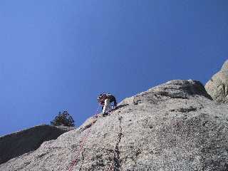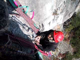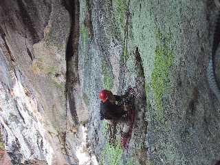 ・我々のとった1ピッチ目(トポでは多分2ピッチ目になると思う)は左コーナーから離れ、 右カンテっぽい所を行く時は、結構ランナウト感があり、マジモードだった。 ・2ピッチ目はボルトもよく安心。終了点もボルトの数は有り、安心なビレーポイント。 ・3ピッチ目はルーフに入るまでが真剣。ハング付け根の下向きクラックは風化は甚だしく、 ぐずぐず状態。右上に垂れるシュリンゲを掴むまでは少なくとも2回はカムを掛ける必要 はあると思う。なお、垂れるシュリンゲは体重制限が必要かも。 ・ハングを抜けてからは暖かい(この日は暑かった)日差しを背に受けてのナイスな人工登 攀だ。
