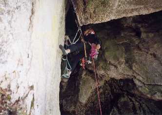切れそうなシュリンゲで体を引き上げ、左上方のボルトにクリップした時点で、完璧にヤルキモードにチェーンジ。後は、ボルトからボルトへ雲梯していけばいいだけだ。ボルトの状態は良好。間隔も近からず遠からずでナイス!!下から見たとは大違い。岩は硬く、ボルトもきっちり打たれたもの。また2本ずつ隣り合う形で打たれ、両者はそれほど古くないシュリンゲで結ばれ、文字通りボルト梯子だ。ズンズンって感じで掛け替えていく・・・が、ルーフが終わるまでの距離があり過ぎ・・・