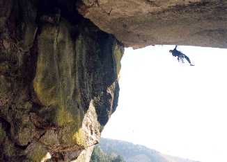 ルーフ2/3あたりで水平ルーフから少し傾斜が落ちるが、程度はわずかで、足がつくような楽な状態にまではならず、相変わらずぶらりん状態が続く。それでも、くたびれきる前にハングを終え、庇上に飛び出す。ビレーポイントはすぐ上だ。