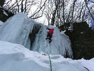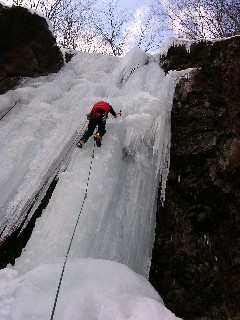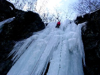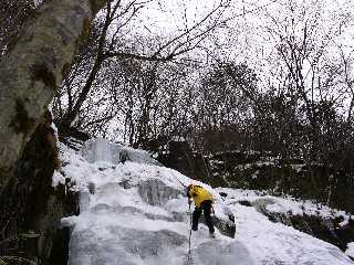 3ピッチ目。5mくらいが立っていて、面白い。氷が薄く、プロテクションの効きが、今一つだった。碓井さんの怒涛の勢いは衰えず、あっという間に終了点へ着くなり、「寒くないアイスクライミングはウェルカムだわね。」とのこと。なるほど・・・
