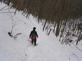 程なく、林道終点となる。車から林道終点までゆっくり歩いて20分。林道終点からは、沢の左(右岸)側を50mくらい進んで行き、今度は、右側(左岸側)に渡る形でトレースがつけられていた。傾斜は強く、ずんずんって感じで左岸斜面を沢に沿って登って行く。かなり高度を上げるから楽ちんではない。疲れ方は、ちょうど、ツヅラ岩(東京近郊奥多摩の岩登りゲレンデとして親しまれている。)のアプローチの後半戦(大滝から壁基部までの急登)と同じアルバイトと感じた。かなり上部で、右から沢が入ってくる。本流らしいものはまっすぐ上がっていっているが、目的の氷瀑は右から入るこの沢にあるため(沢登りのトポ風に表現すると、直上する沢とこの沢は概ね1対1って感じ)、直上してはいけない。右に入って少し行くと上方に犬殺しの氷瀑が見えてくる(右手上方の尾根は岩坊主風だ)。歩き始めてすぐに氷瀑を目視していなかった我々だけど、もしトレースがなかったら、多分、アプローチできなかったと感じた。
