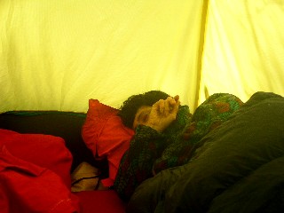当然、我々はテントに入ってくつろぎタイム。水をつくりながら、芋焼酎で上機嫌な羽矢とは対称的に碓井さんはシュラフに入り込み、ウツラウツラ・・・
