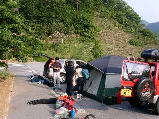 この夜は、上のダム管理事務所駐車場でルーデンスOBの森江さんとそのお友達も加わり大宴会だ。