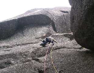 4ピッチ目。立ち木をよじ登りスラブに乗り移ることから始まるこのピッチも楽しかった。乗り移ってからダイクを右へ進み、ボルトにクリップした後、上の浅いポケットに赤エイリアンを上手にセットし、さらに一段上がり、今度は左へ一歩体を移動させるのはかなりテクニカル。池野さんは少しためらいながらも、難なくクリア。お見事。そこからハングの付け根に沿うかたちで上がっていき、姿が見えなくなる。僕もルーデンスチームに遅れまいと続くが、ハングの付け根あたりの岩の構成が少し複雑で、カムのセットにもたつく。ロープの流れが悪く、苦労させられた。
