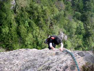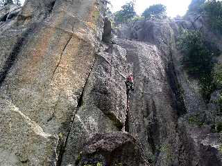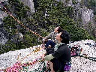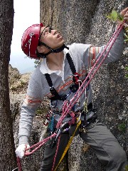 最終ピッチはボルトからボルトの人工ピッチ。やはり、やる気満万の北林さんにここも行っていただく。なにしろ、このピッチに備え、北林さんは自宅のガレージでアブミに乗る練習を重ねてきたとおっしゃる。実際の岩場で、しかも長いこのピッチ、大丈夫だろうかと、少し心配だったが、そんな心配をよそに、ずんずん突き進み、あっという間に終了点へ。とてもアブミ初体験とは思えないリードに拍手。