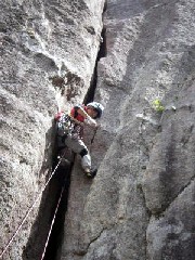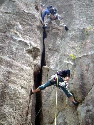 だけど、このピッチの核心はここではなかった。その先のオフィズスにあった。一見なんてことの無いこのクラック。一旦入ると、もがこうが叫ぼうが、体は・・なかなか上がらない。何とかリズムを掴もうともがきもがき、ずり上がる。汗だくになって抜け出し、さらに、上のプロテクションがプアなところは上からアドバイスをもらって終了点へ。