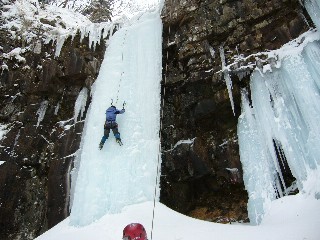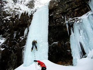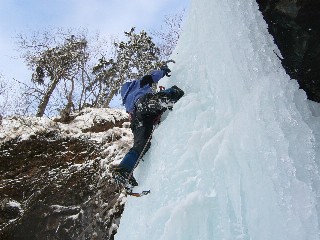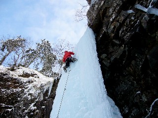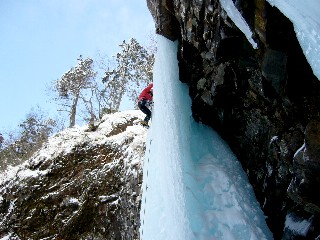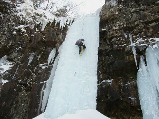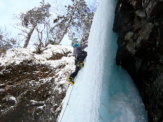 さて、実質2本目のリーシュレスでの氷柱。年末の大同心大滝ではそれなりに腕は張った。だから、今日も初めは緊張していたけど、1本目を取ってからはノミックの快適さを楽しめるようになった。気温に反して氷は硬いが、スクリューの立て込む場所は容易に見い出せ、今回は比較的ラクチンに都合5本、等間隔にセットし抜けることができた。腕、肩ともにそれほど強いストレスを感じることなく攀りきれたことが嬉しかった。右(左岸側)に垂れてきている下降用ロープ支点にセットし、下降。