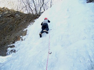 "暖かく、手足の痛みがないときのアイスクライミングは最高。早速、F1のリードに掛かる碓井さん。"