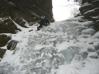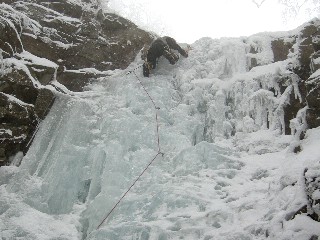 さて、変わって僕のフォロー。フォローの難しさ、辛さはクライミングを開始する時点で手が冷え切っていること。ビレー中に冷え切ってしまった心もとない手でスクリューを抜く動作も辛い。これまでほとんどをリードさせてもらって、美味しいところを頂いて来ていたが、あらためてフォローの難しさを思い知る事となった。また、上部の例の軌道修正箇所は足元がおぼつかなく、かなり真剣だった。いつだってそうだけど、フォローしているときは、よくリードしたよな、って怖さがついて回り、怖さを助長する。