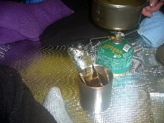"テントに戻り、まずは一杯。下降途中に取ってきたツララのオンザロックだ。"
