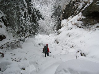 大滝下に大きなチョックストンが形成する難関がある。通常は左岸を少しチャレンジングなムーブで超えて行く所だが、今日、そこまで辿り着く間、もしかすると手前右岸側を巻けるのではないかと考えていた。ここへ来てみると、なんとずばり手前で浅いルンゼ状を上がって行っているトレースが。やはり!という感じ。ありがたくトレースを使わせていただき、結局、大滝下までロープを出すことなく辿り着く。