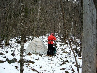翌土曜は入山だけだからゆっくりと起き出し、テント撤収。気温はマイナス6℃だし、寒風吹きっ晒しだから、素手に堪えた。実は、この撤収が今回の山行中一番辛いものであった。