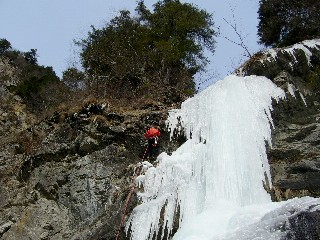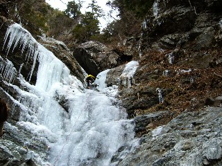 左へ少しだけトラバッて一本決め、テイクオフ。こちらの氷柱もツララの集合体だからスクリューのポイントに迷うがそれでも時々不安なく効かせられて、そのたびに碓井さんに、きっちり決まっていますからと、自分に言い聞かせるように声をかける。ガイドブックには大同心大滝程度の難しさがあると書かれているけど、実は、僕が攀った氷瀑の中では大同心大滝が一番難しいものとしてランキングされている。